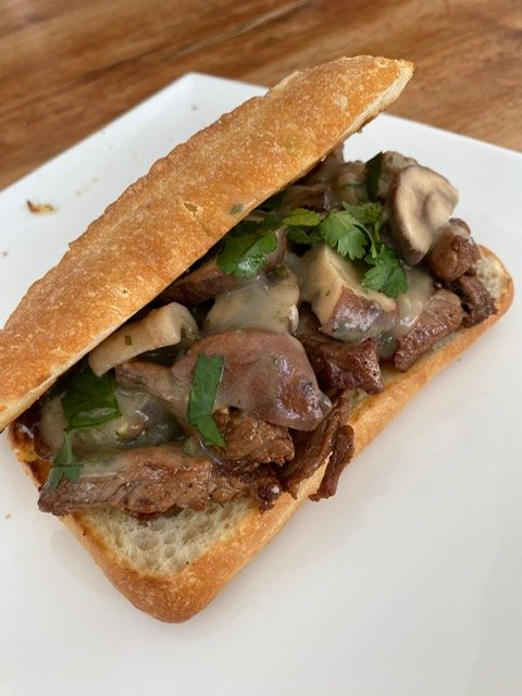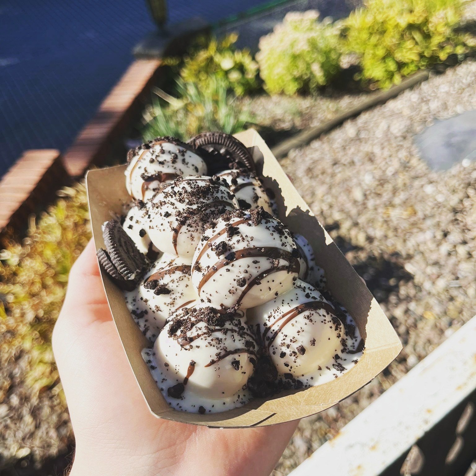 Gefüllte Brottaschen mit Gemüse und Soßen, belgische Pommes mit Basilikum-Sourcream, Schneebälle
