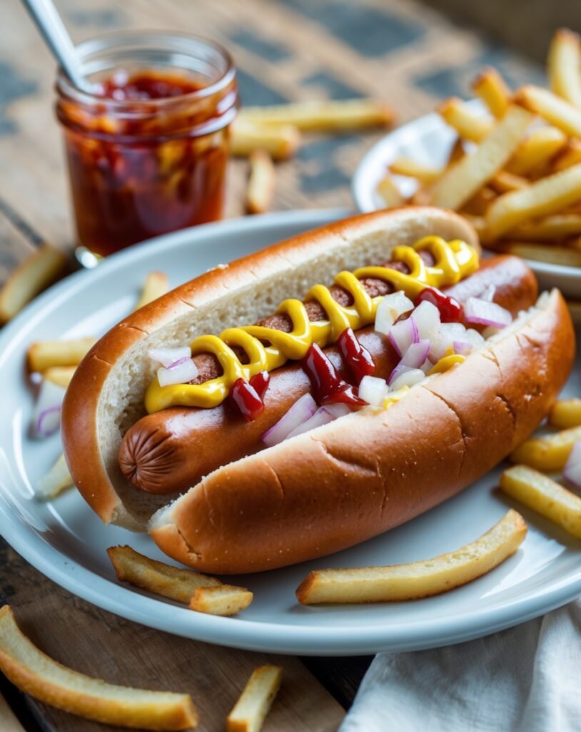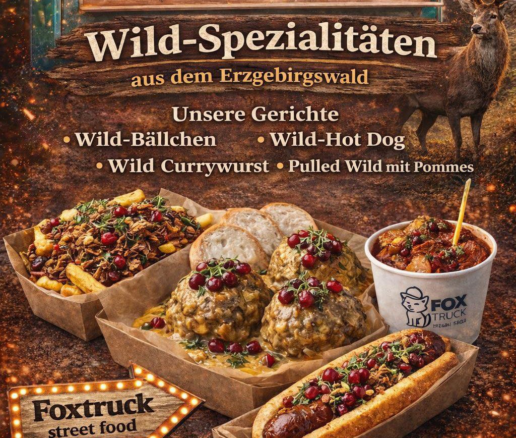 Gezupftes Curry Wildfleisch mit Pommes, Wild hot dog mit Preiselbeersauce, Wild-Fleischbällchen.