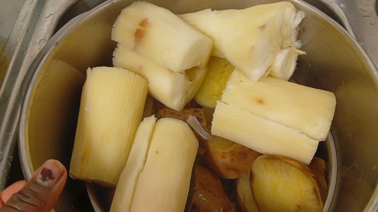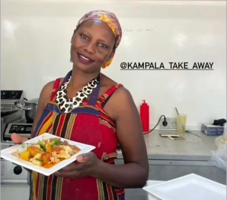 Uganda, Kochbananen, Bohnen in Sasamsoße, Hühnerfleisch in Sesamsoße, Rolled Eggs